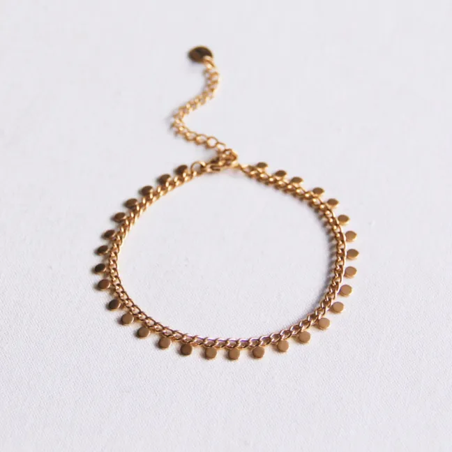 Dit Bazou armbandje met muntjes in goud is een echte blikvanger door zijn verfijnde en tijdloze uitstraling. De kleine gouden muntjes vangen het licht op en zorgen voor een elegante glans rond je pols. Het armbandje is gemaakt van hoogwaardig materiaal en voelt licht en soepel aan, waardoor het de hele dag comfortabel draagt.
